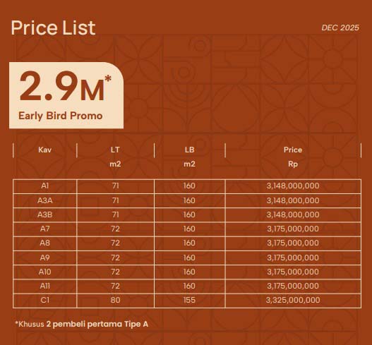 Harga mulai dari Rp 3,148 M s/d Rp 3,325 M, LT/LB mulai dari 71m²/160m² s/d 80m²/155m², ada promo seharga Rp 2,9 M untuk 2 pembeli pertama type A, dekat ke Pejaten Mall, Australian School, Rumah Sakit, Sekolah Prestige, Resto, dll